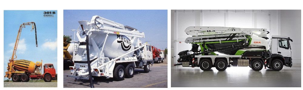 El primer modelo de hormigonera con bomba fue el Cifa 301B, presentado en la feria Samoter de Verona. El proyecto se centró en las necesidades del mercado italiano de la construcción, un contexto caracterizado por obras a menudo ubicadas en el centro histórico y de difícil acceso. Por primera vez, un fabricante combinó la capacidad de transporte de hormigón con la posibilidad de distribuirlo en la obra, fusionando la hormigonera con la bomba. La hormigonera con bomba tuvo un gran éxito comercial por su capacidad para encapsular en una única solución el trabajo de dos máquinas, convirtiéndose en el medio ideal para pequeñas empresas y obras con espacio limitado (centros históricos, zonas montañosas, etc.). El equipo inicialmente contaba con un tambor de 4 metros cúbicos, un único cilindro estabilizador trasero, un brazo distribuidor de 17 metros en dos secciones montado en la parte posterior y un grupo de bombeo transversal completo con tolva de recogida, mezclador y un único cilindro de empuje de doble efecto. Posteriormente, la máquina también se equipó con un brazo montado en la parte delantera con dobles cilindros estabilizadores delanteros.