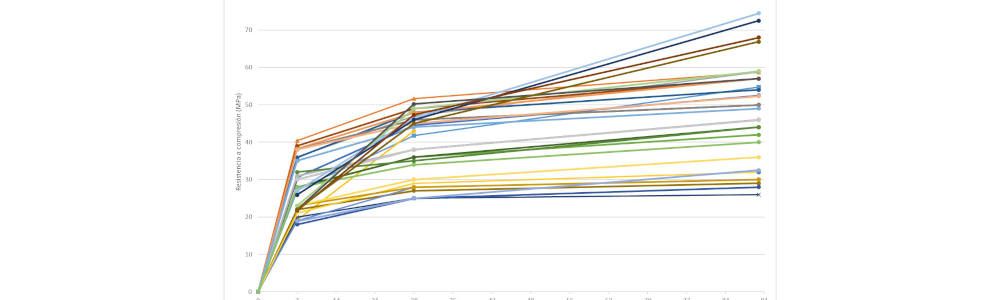 Existe una tendencia creciente según aumenta la edad de curado de las probetas. Ese incremento se va atenuando a partir de los 28 días de curado para todas las muestras, excepto las muestras correspondientes a las tobas volcánicas alteradas, lo que podría indicar que las probetas continuarán ganando una resistencia significativa en edades más tardías. El resto de muestras tienen un comportamiento similar y su rango de resistencias varía entre los 25 y los 50 MPa a los 28 días de curado, llegando a alcanzar casi los 60 MPa a la edad de 90 días (Costafreda, J., et al., 2021; Domingo et al., 2021; Domingo, D.A. et al., 2023; Presa, L., et al. 2023)
