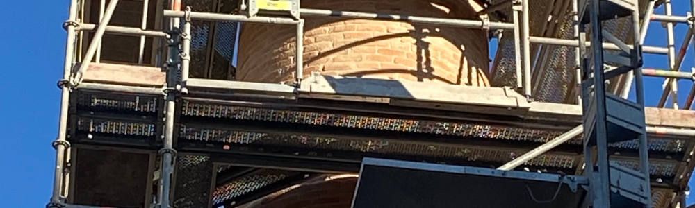 En los anillos del exterior de la chimenea, con los fioccos insertados, se recibió una primera capa del mortero bicomponente, fibrorreforzado, a base de cal hidráulica natural (NHL) y Eco-Puzolana, de elevada ductilidad, PLANITOP HDM RESTAURO, se insertaron bandas de malla fibra de carbono de elevada resistencia MAPEGRID C 170 sobre el mortero fresco, se abrieron los fioccos en abanico, y se fijaron mediante MAPEWRAP 31, por último, se espolvoreó la porción deshilachada ya fijada hasta saturación con arena de QUARZO 1,2 seca.