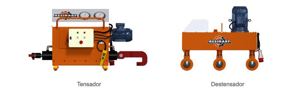 Entre los equipos complementarios que Resimart ofrece a los fabricantes de pretensados de hormigón, se encuentra una amplia gama de sistemas para el tensado de cables o cordones, así como sistemas para el destensado progresivo una vez fraguado el hormigón.